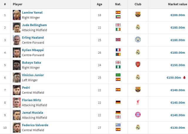 全球球员身价TOP10。这当中西甲占据6席,此外还有英超的哈兰德、萨卡和维尔茨,以及德甲的穆西亚拉。
