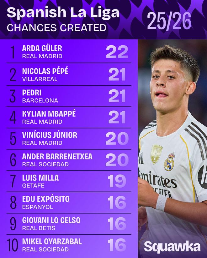 雷速体育10月7日讯 外媒统计了本赛季西甲创造进球机会次数排行榜,皇马中场居莱尔以22次居首,尼古拉斯·佩佩、佩德里以21次紧随其后。